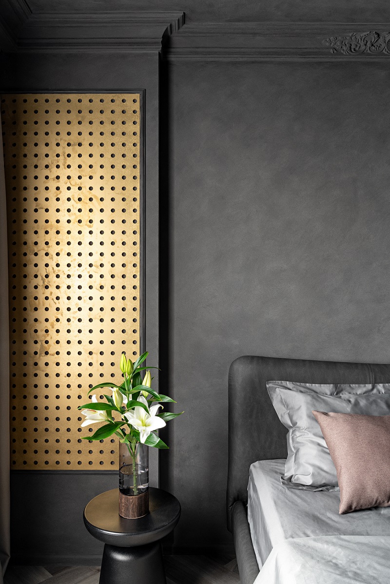 Серые тона хорошо контактируют с металлом, но с золотыми акцентами — особенно. Такой акцент будет более ярким, чем хром или сталь, поэтому нужно знать меру.