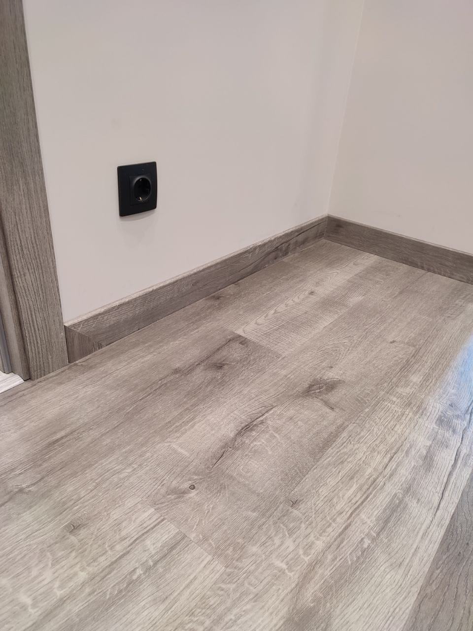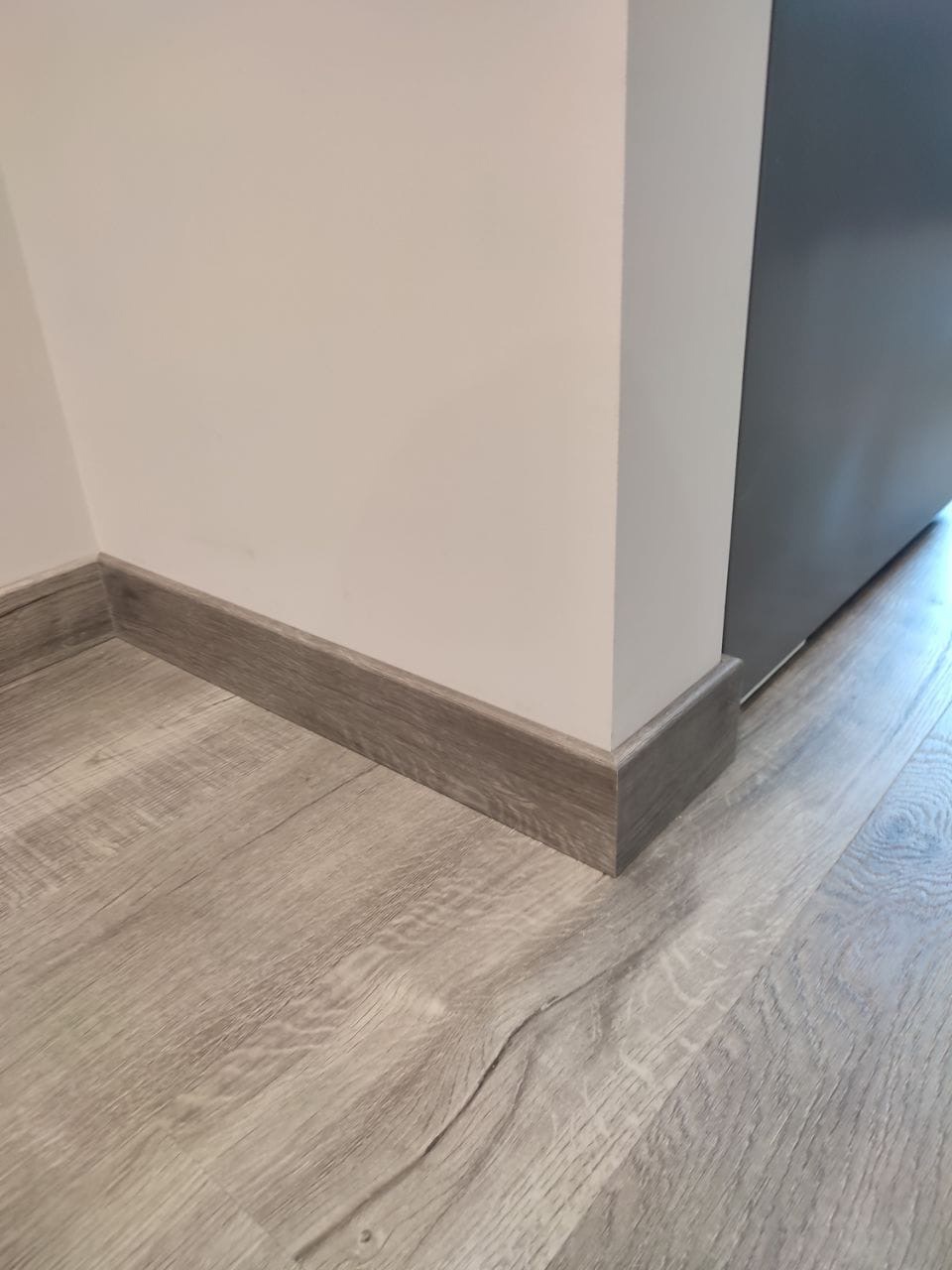 Для оформления стыка со стеной мы выбрали также и дюрополимерные плинтуса этой фирмы. Меня привлек лаконичный дизайн, легкость монтажа и возможность покраски - больше не будет проблем с выбором плинтуса под цвет пола.